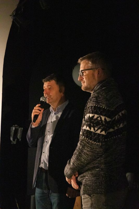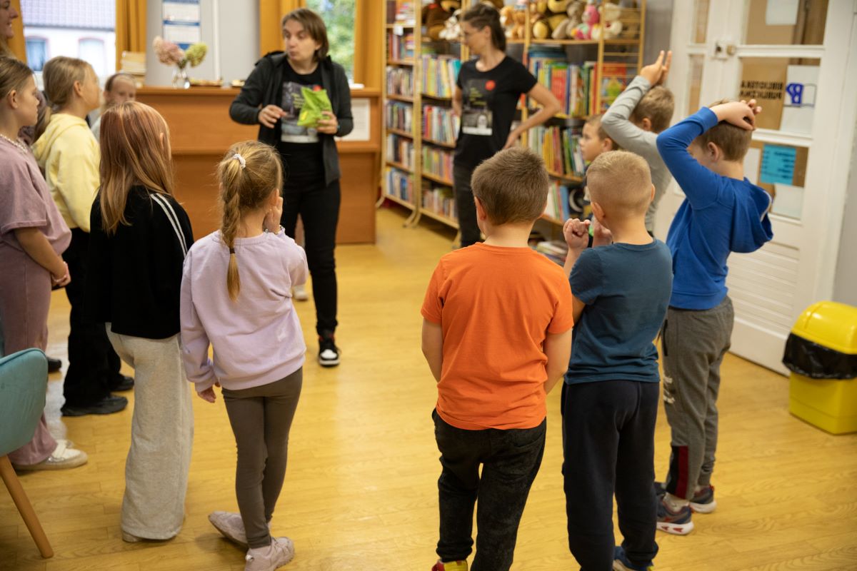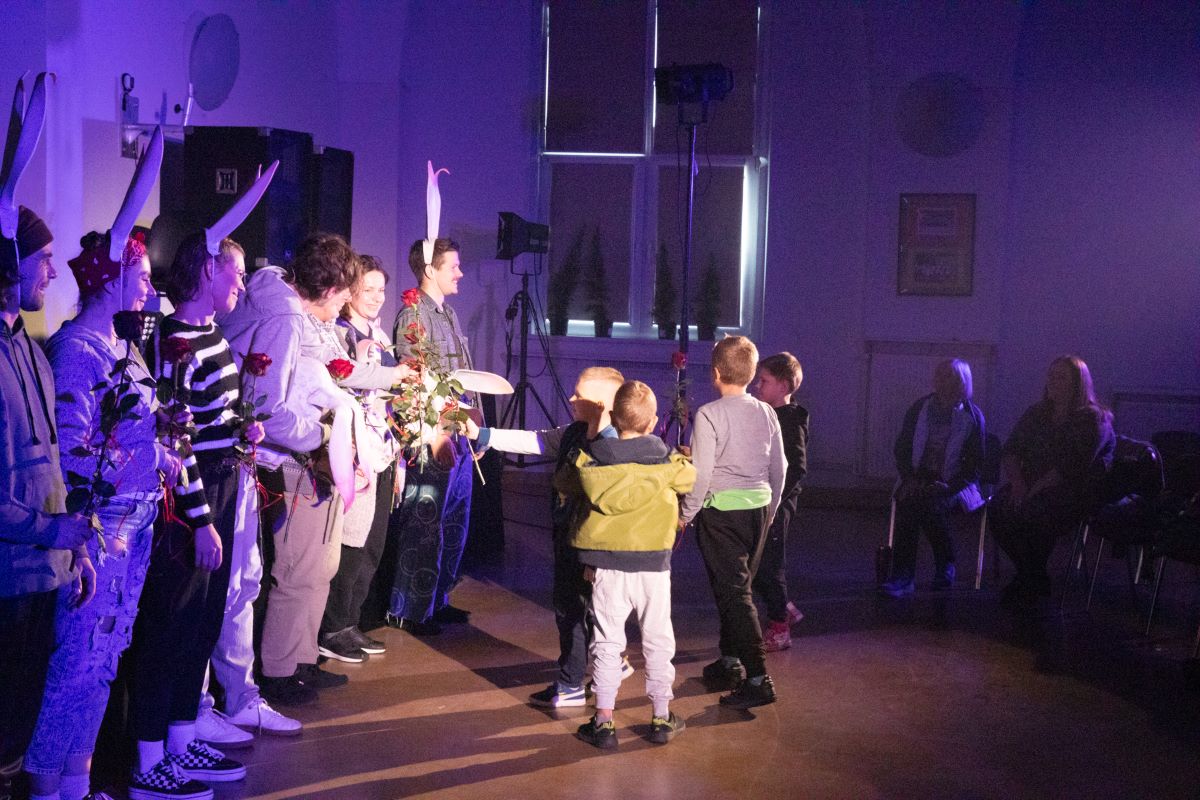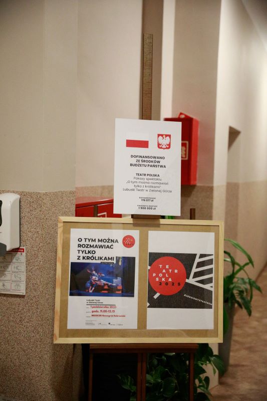 Drugim przystankiem na mapie wyjazdów w ramach Teatru Polska był Miejsko-Gminny Ośrodek Kultury Sportu i Rekreacji w Nowogrodzie Bobrzańskim (1.10.2025 r.). Dostosowanie spektaklu do warunków panujących na danej scenie to zawsze wyzwanie – zespół techniczny jedzie dlatego do danego miejsca dzień wcześniej i przygotowuje przestrzeń. Tak było i tym razem: dzięki temu, mimo wyzwań technicznych, wszystko przebiegło bez zakłóceń. W warsztatach poprzedzających spektakl (prowadzonych przez Emilię Adamiszyn i Joannę Marcinkowską) wziął udział działający już od 15 lat Teatr Elfik. Spektakl „O tym można rozmawiać tylko z królikami” odbył się przy pełnej widowni, a po przedstawieniu widzowie mieli sporo pytań do naszych aktorów, którzy chętnie słuchali także refleksji, związanych ze spektaklem. Biorący udział w dyskusji widzowie otrzymali pamiątkowe gadżety oraz książkę.