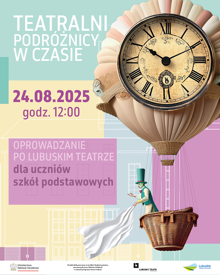 W październiku i listopadzie realizujemy cykl oprowadzeń po Lubuskim Teatrze pt. „Teatralni podróżnicy w czasie”. To niezwykła wyprawa, w której uczestnicy poznają historię budynku i jego architekturę, a przy okazji mogą sprawdzić swoje umiejętności w kreatywnych zadaniach. Na trasie czekają: zagadki do rozwiązania, ćwiczenia dla przyszłych projektantów, odkrywanie teatralnych sekretów ukrytych w kulisach. Na oprowadzanie zapraszamy klasy szkół podstawowych. Udział w oprowadzaniu jest bezpłatny.
